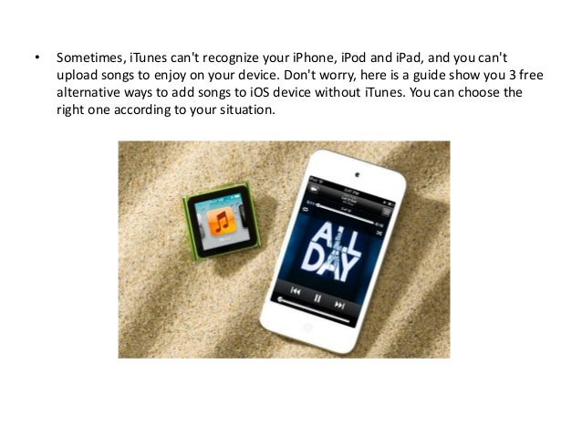 Transfer iPhone/iPad/iPod touch music, videos and photos to Mac and iTunes. One-click backup to iTunes and manage your songs, videos, and photo albums. Copy music from iPhone, iPod, iPad to Mac or iTunes. Question: Q: how to put music onto ipad without using iTunes/ sync? I am new to the i world just bought the new ipad 32gb wi-fi only need help I want to download my music files from usb to my ipad but i read thru all these messages andstill cant figure out I am really not computer savy.